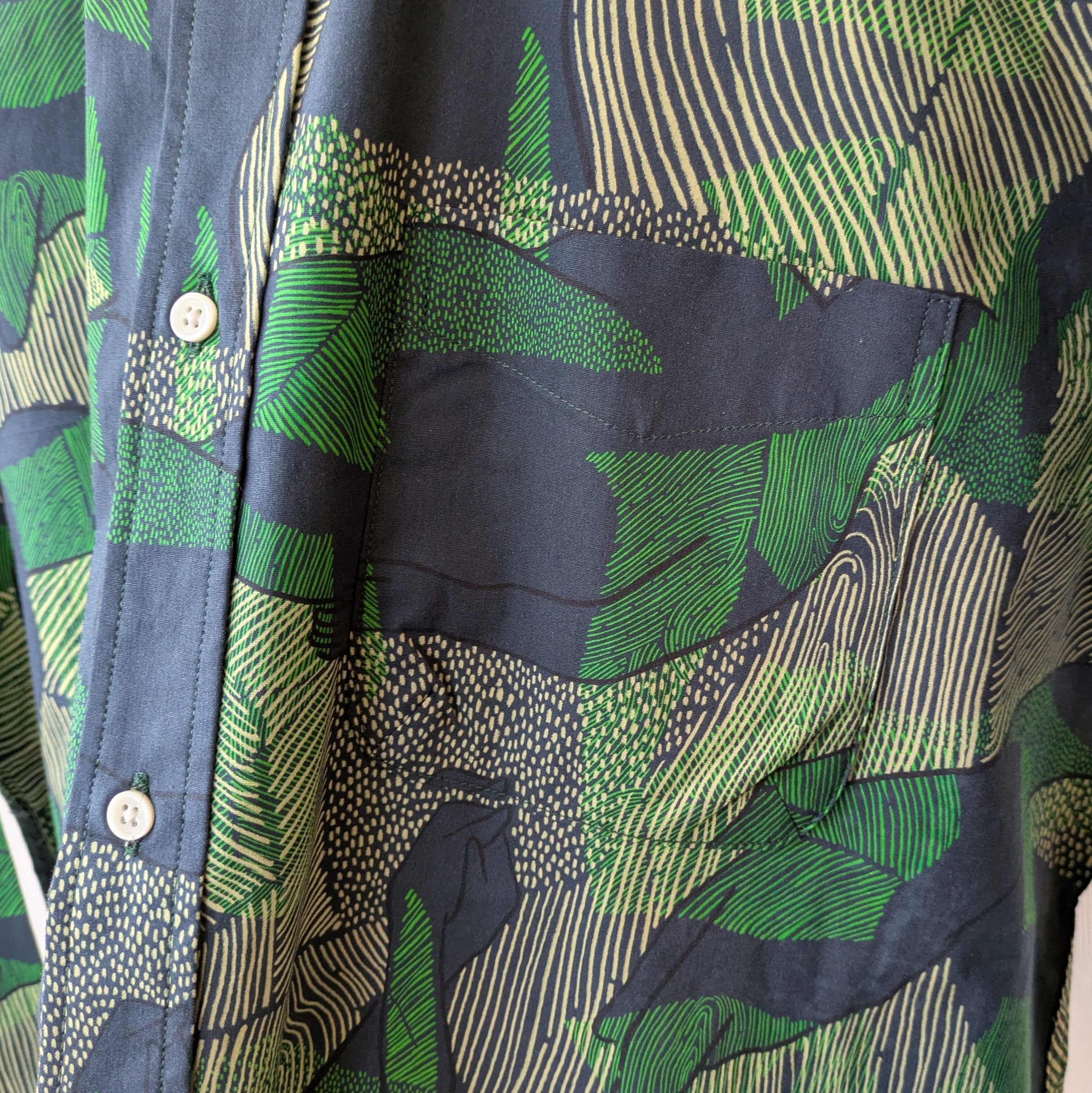 ボタニカル調グリーンが鮮やかな総柄シャツが入荷。