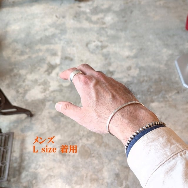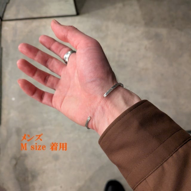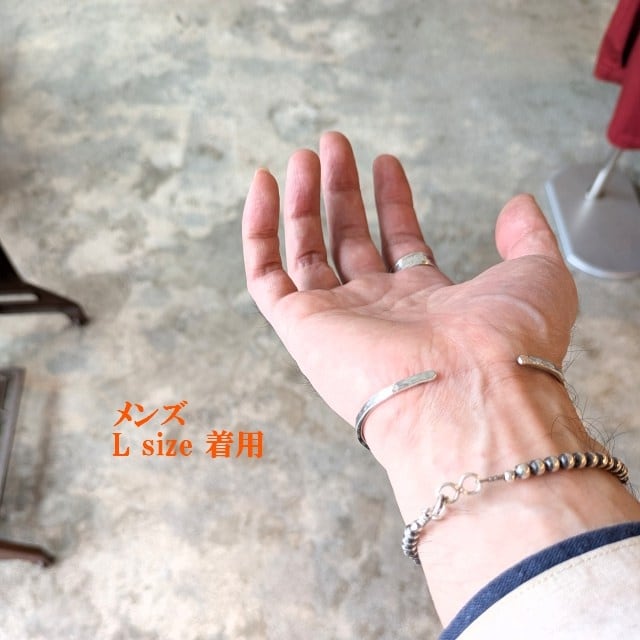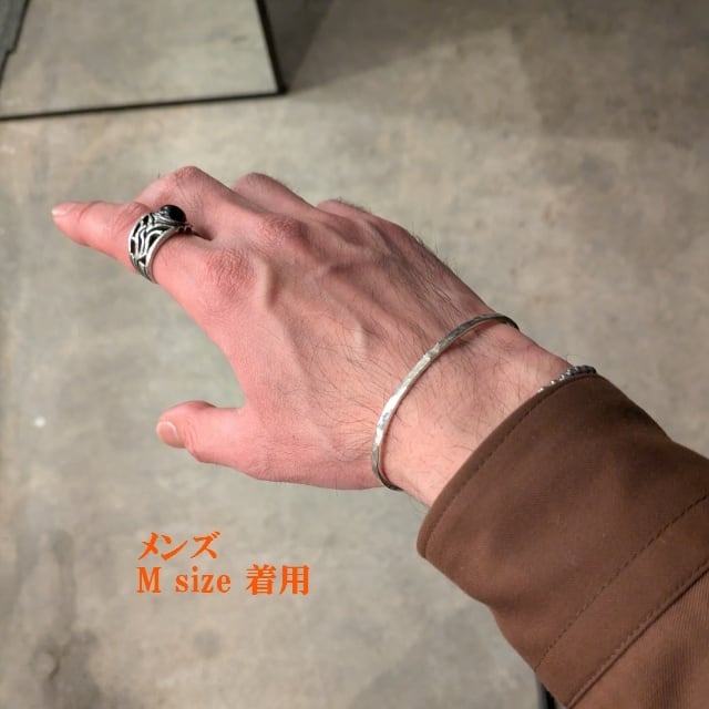 細めのシルバーで主張も強すぎないサイズに、叩きによる模様(ハンマード)を施したバングルです。
