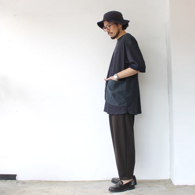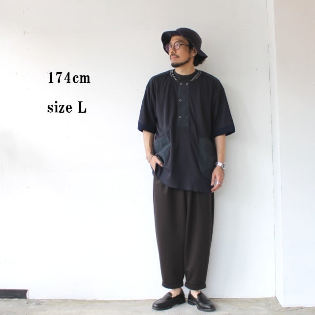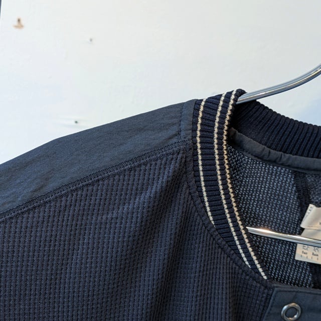 ワッフル生地のヘンリーネックTをベースに、フロント前立て部分、ポケット、肩に塩縮ナイロン生地を配しデザインアクセントにしたカットソー。
