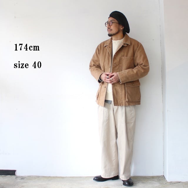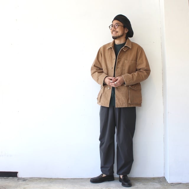 染料技術に乏しかった頃の中まで染まらないダックをリプロした中白素材を使用し、製品にて ストーンバイオ加工を施し履き込んだような風合いを持つ。ゆったりとしたシルエット。