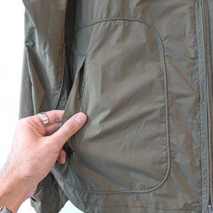生地は撥水性抜群な軽量ナイロンを使い、軽い着心地と悪天候でも気軽に着れる安心感を実現。