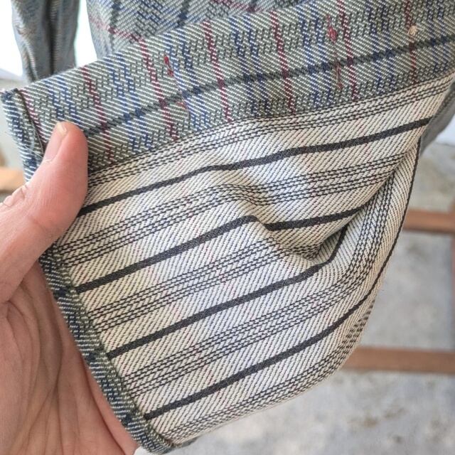 生地を裏返すとストライプ状の織り組織となっていて、何色もの糸を複雑に交錯させて仕上げているため、他にはない奥行きのあるチェック柄になっています。
