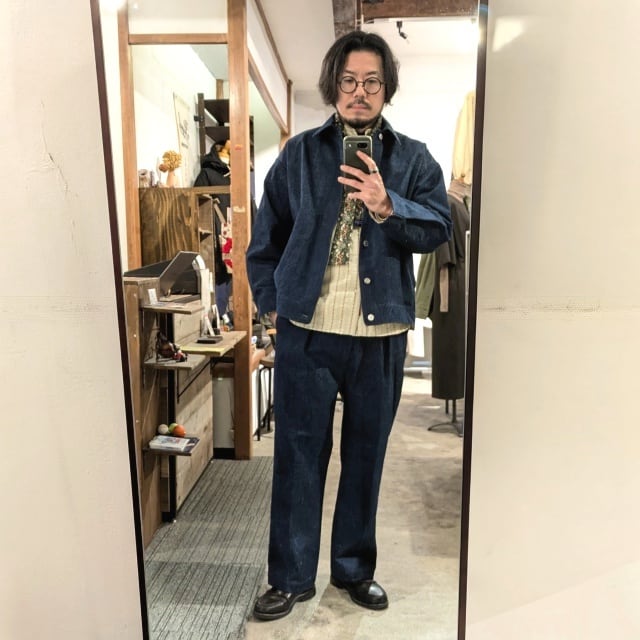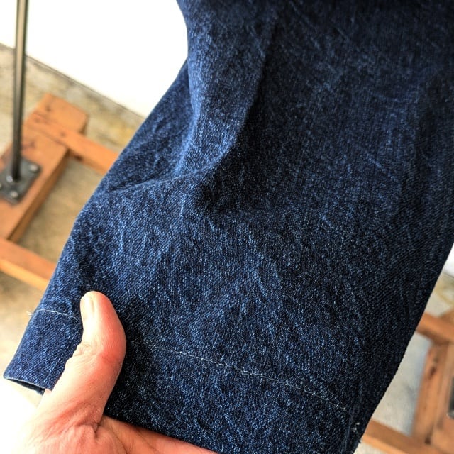 "原反洗い"という手法を用い、生地の段階でのストーンバイオウォッシュを施工し、迫力のあるシボ感や洗いジワで唯一無二な風合いを生み出しています。