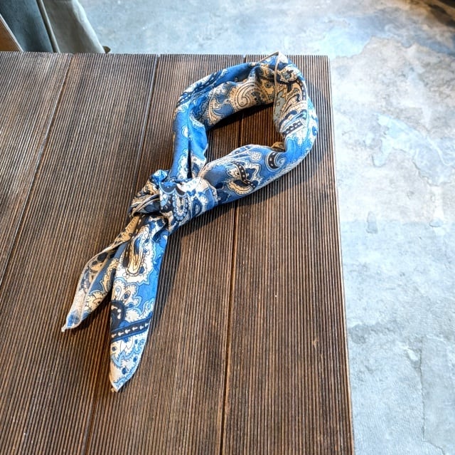Bohemiansオリジナルプリントを施したバンダナをサイズアップして首元に巻きやすいデザインにアレンジ。