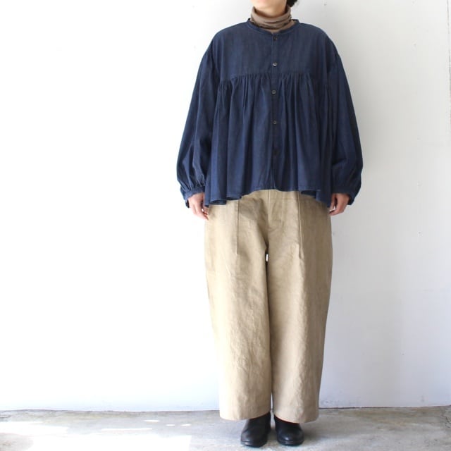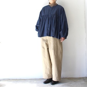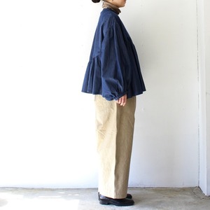 Aラインのシルエットに、程よいパフスリーブと丸みのある袖口に仕立てて、アンティークブラウスの様な雰囲気を出しつつ、着用しやすいサイズ感に落とし込んだ1枚。