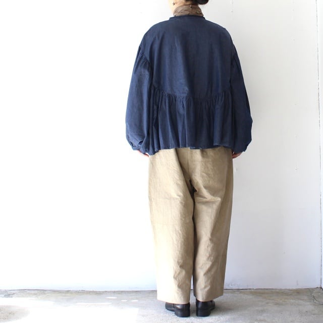 生地は、手染めで出した色ムラ感と、天日ワッシャーで仕上げたヴィンテージのような深いシワ感が合わさった高密度コットンツイル。