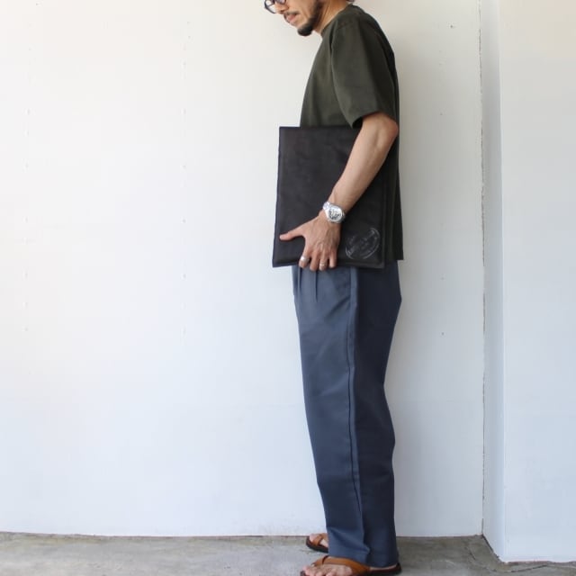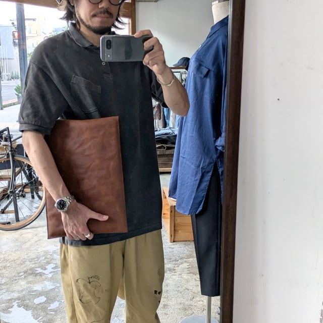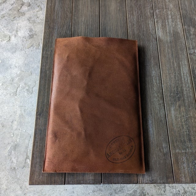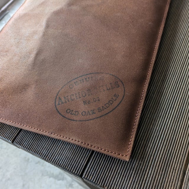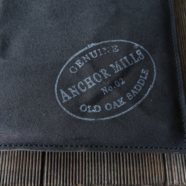 ラフアウト(牛革の床面)を手染め、オイル、コガシ加工、”ANCHOR MILLS 社製”スタンプなどでヴィンテージ紙のような風合いに仕上げました。
