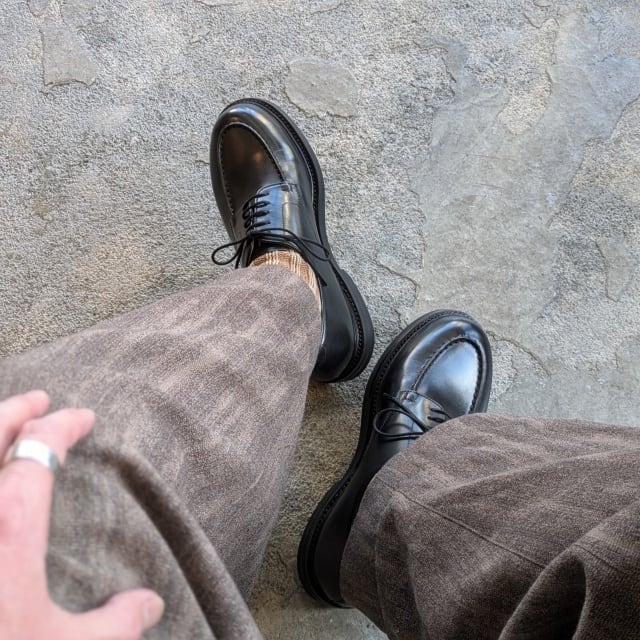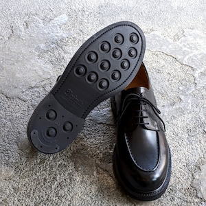 甲革は滑らかな表面の上質なフレンチカーフ、アウトソールにはイギリス製ダイナイトソールを使用しており、耐久性・耐滑性が高く、日常履きはもちろん、雨の日の着用にも適しています。