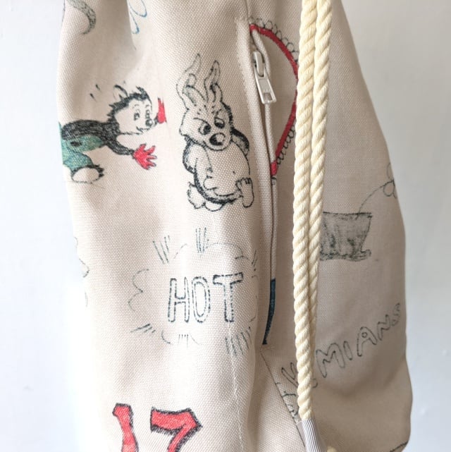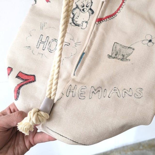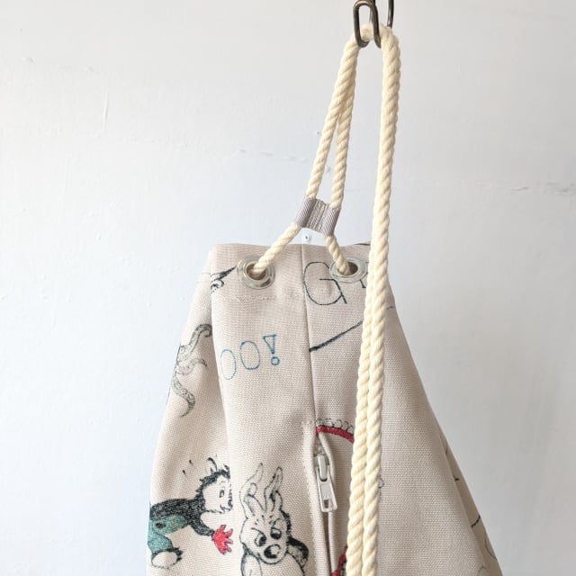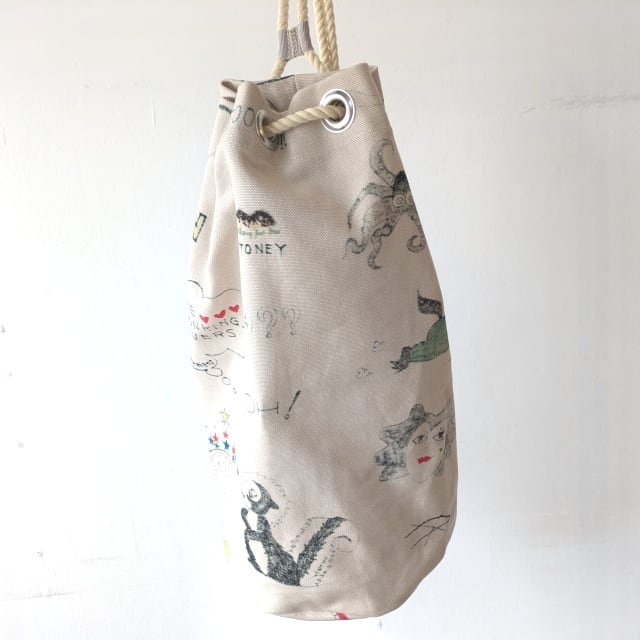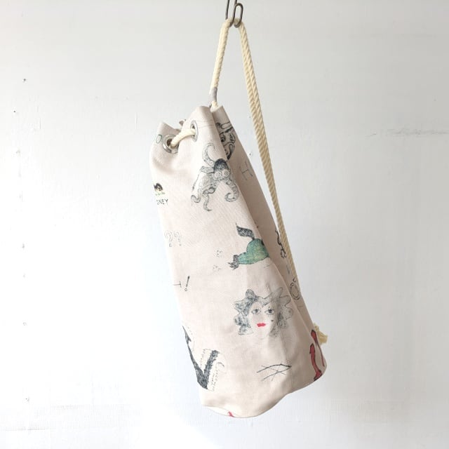 キャンバス生地のミニサックバッグ。