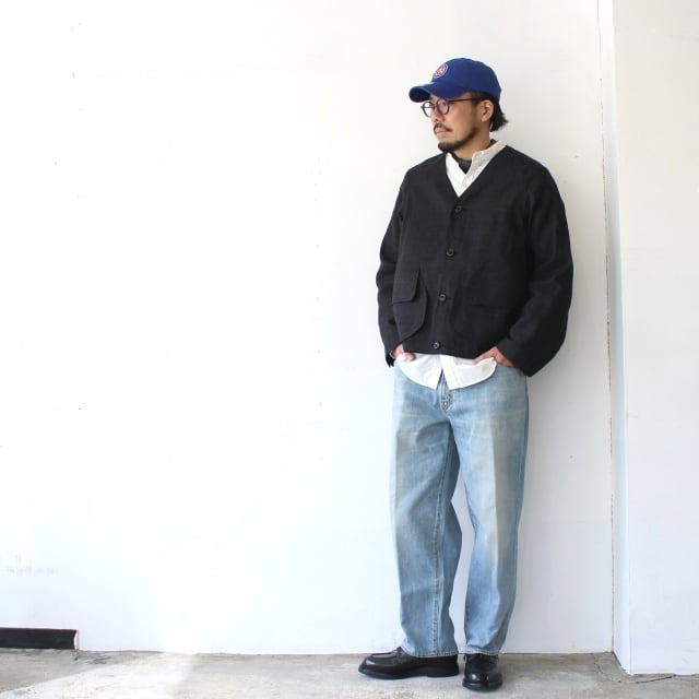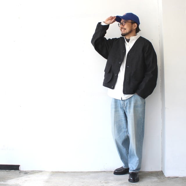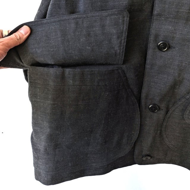 後身まで跨いだ大きなマチ付きのハーフムーンポケットが特徴的なノーカラーワークジャケット。