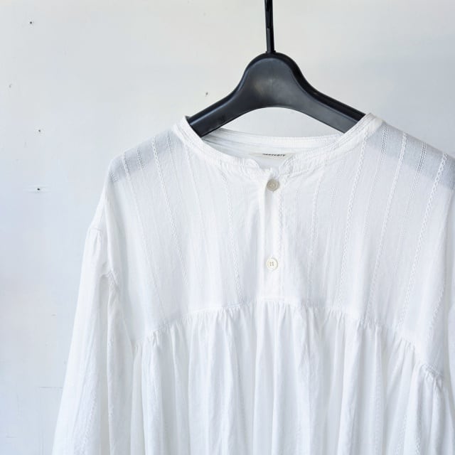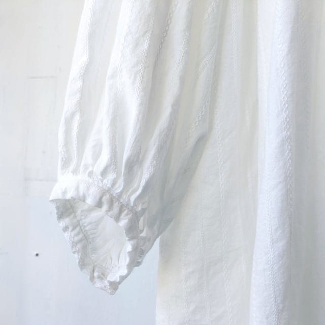 Aラインのシルエットに、程よいパフスリーブと丸みのある袖口に仕立てて、アンティークブラウスの様な雰囲気を出しつつも、着用しやすいサイズ感に落とし込んでいます。