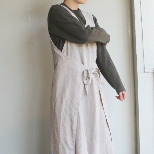 紐を前で結べばワンピースとしてのアクセントに、後ろで結べばエプロンとしてワークウェアになります。