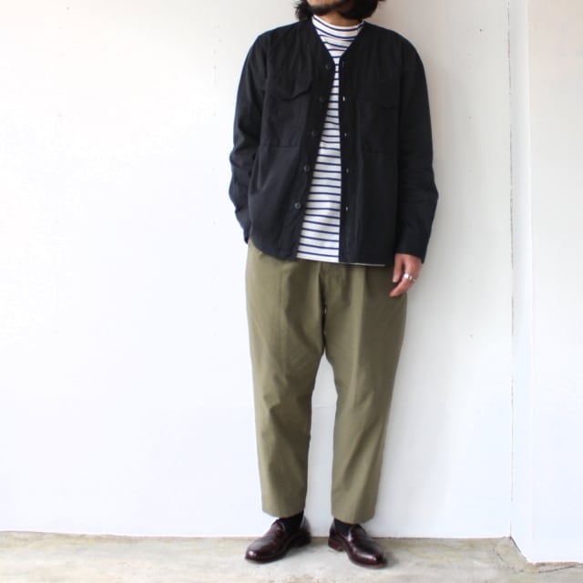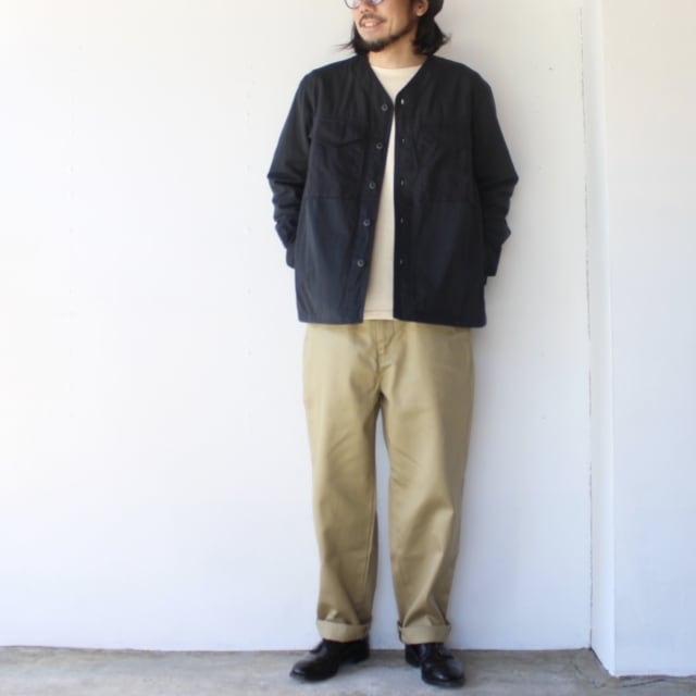 CPOジャケットをベースにした襟無しデザインの羽織り。
