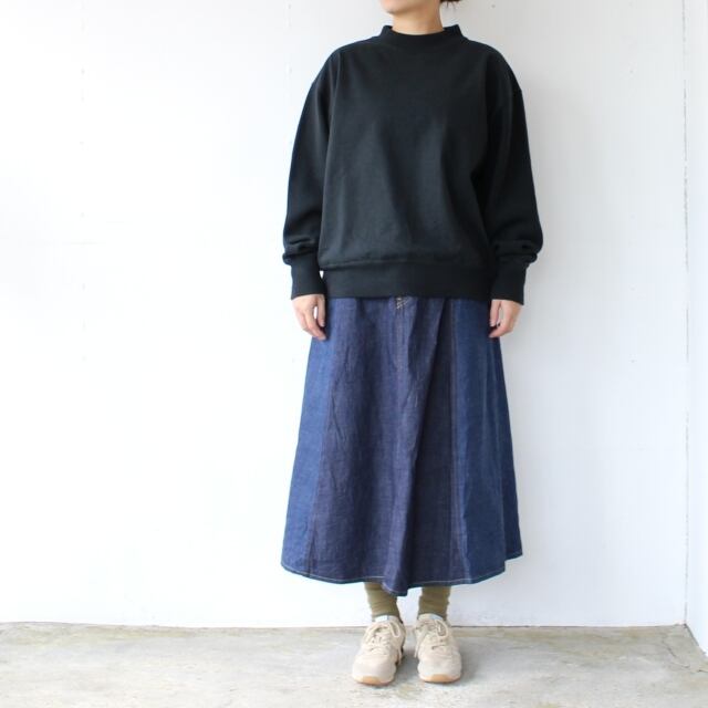 濃淡2色の8オンスデニム生地をつなぎ合わせた、配色デザインのスカート。