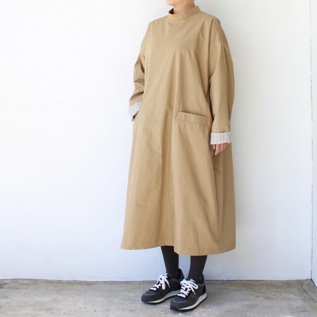 ハイネックデザインをベースに、ゆったりしたAラインのシルエット、フロントにはポケットを備えたシンプルでありながら主役になるワンピースです。