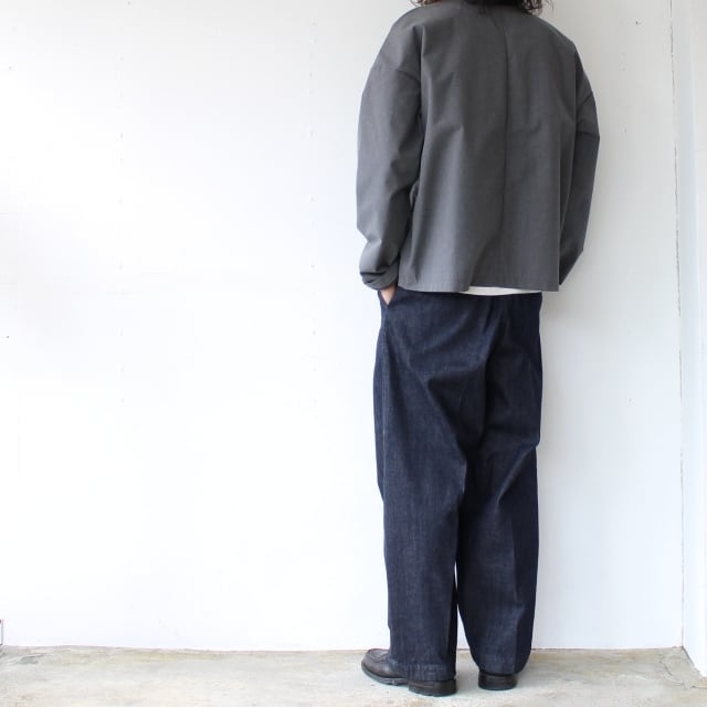 ワークウェアのようなパリッとした硬さのある質感が特徴で、着ていくごとに馴染ませていく過程も楽しめます。