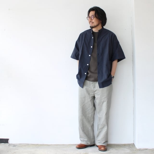 綿×麻のタイプライターで作られたバンドカラーシャツ。