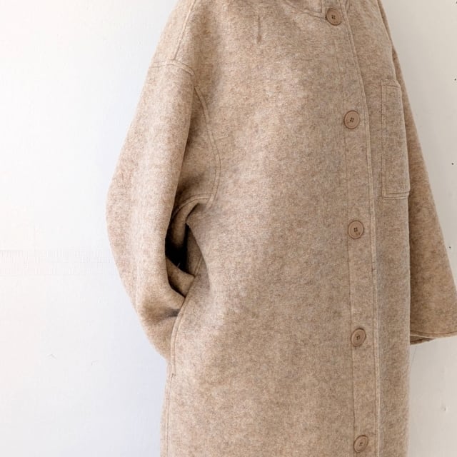 フードは立体的になるスタンドカラー、柔さらにらかく丸みのあるコクーンシルエットが落ちることなくしっかり決まるデザインです。
