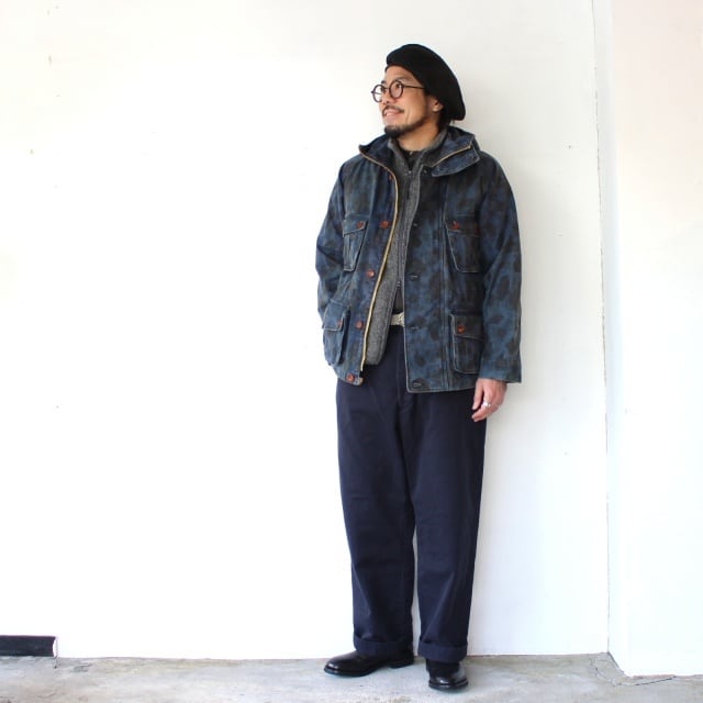 ヘリンボーン織のダックハンターカモ柄の生地に、表のみはインディゴで染めています。